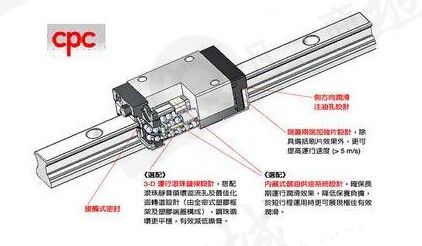 滑動導(dǎo)引若潤滑不足,將會造成接觸面金屬直接摩擦損耗床臺,而滑動導(dǎo)引要潤滑充足并不容易,需要在床臺適當(dāng)?shù)奈恢勉@孔供油。CPC直線導(dǎo)軌則已在滑塊上裝置油嘴,可直接以注油槍打入油脂,亦可換上專用油管接頭連接供油油管,以自動供油機潤滑。