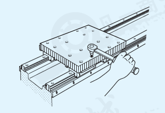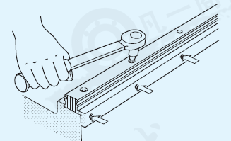 · 用壓板或緊固螺釘使直線導軌Ⅰ的滑軌安裝基準面貼緊底座的安裝基準面,擰緊同一位置上的固定螺栓。從一端起反復用該方法依次將滑軌固定。