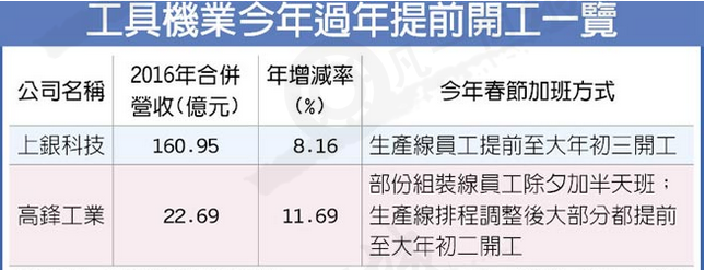 臺灣工具機業(yè)過去幾年包括上銀科技、程泰、亞崴、臺中精機、永進、友嘉、遠東機械、東臺、臺灣瀧澤科技及高鋒等工具機廠及零件業(yè),為了趕急單,即使遇到過年生產線也照樣排班不停工;但今年一例一休上路,員工加班不單要支付2倍薪資,零件業(yè)僅上銀及大銀微系統(tǒng)加班趕工,工具機廠目前也僅高鋒提前開工,其他廠商普遍選擇大年初六恢復上班,年節(jié)提前開工不如往年熱絡。