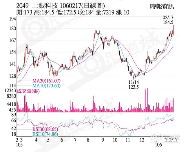 上銀大廠(2049)拜大陸對智慧自動化及工業(yè)用機器人需求持續(xù)暢旺所賜,上半年訂單滿手,2月持續(xù)加班趕工,市場預期2月營收超越去年同期8.45億元,上看10億元,外資及自營商17日合計買超3,888張,推升股價以184元作收,上漲10元,創(chuàng)2015年11月以來新高。