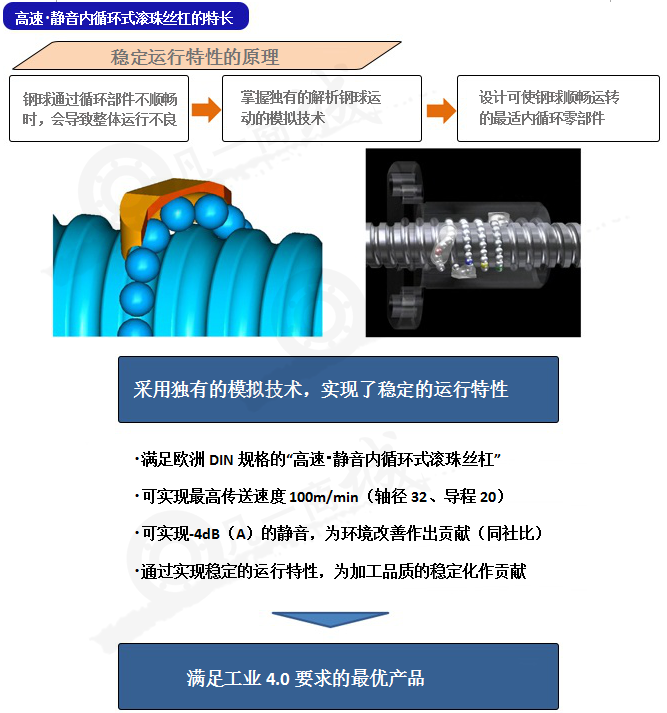 NSK采用獨有的高速、靜音技術(shù),相比于NSK以往的內(nèi)循環(huán)式滾珠絲杠,實現(xiàn)了-4dB(A)的靜音性。