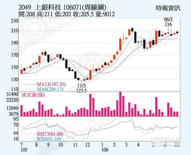 上銀科技(2049)拜大陸、歐洲及日本客戶對滾珠絲桿、直線導軌及機器人三大主力需求旺,在手訂單看到年底,日本汽車大廠跨海來臺洽談采購關鍵零件,外資估6月合并營收超越5月續(xù)創(chuàng)單月新高,上周五逆勢上漲2元而以205.5元作收,收復月線及季線,上周股價收平盤。