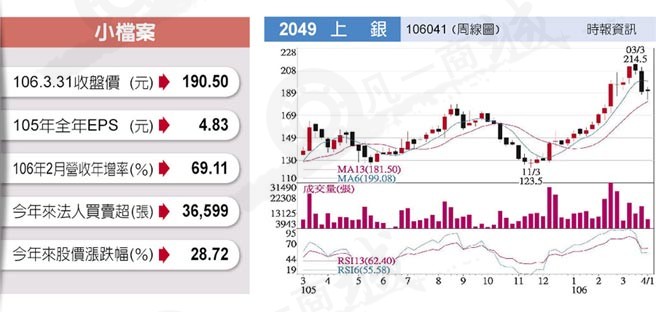 上銀科技(2049)今年對上銀滾珠螺桿、上銀直線導(dǎo)軌及機器人三大主力產(chǎn)品需求增溫,從去年第1季末到第2季初旺到現(xiàn)在,上半年訂單滿爆,生產(chǎn)線加班趕工,1至2月合并營收26.98億元,年增45.95%,擔(dān)心工具機廠重復(fù)下單,下半年轉(zhuǎn)趨謹(jǐn)慎,務(wù)實接單,全年合并營收有機會續(xù)創(chuàng)新高。
