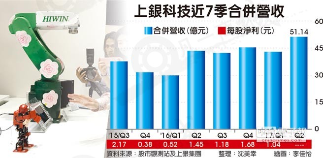 全球吹起工業(yè)4.0風潮,對智慧自動化設(shè)備及機器人需求殷切,全球景氣又逐步回升,帶旺上銀(2049)6月合并營收攀升至17.71億元,創(chuàng)單月新高;第2季營收創(chuàng)單季新高,上半年營收也創(chuàng)同期新高,表現(xiàn)優(yōu)于預期。上銀年底前訂單滿載,目前接單到出貨至少要等半年時間。