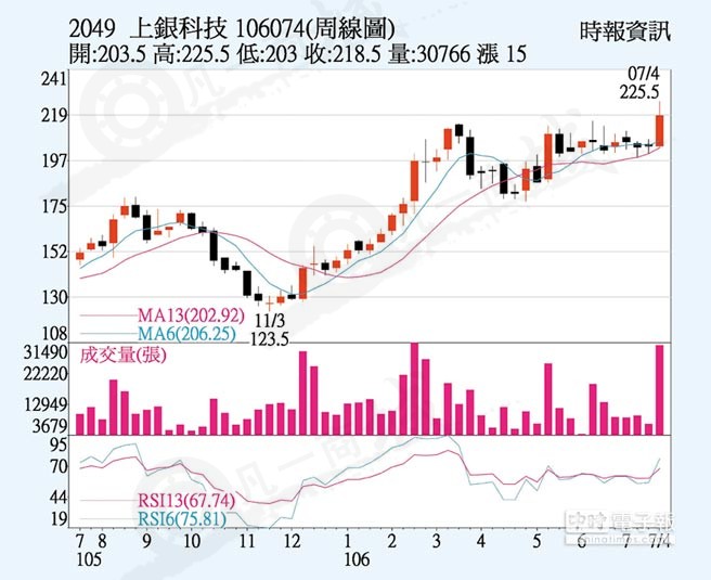 因今年工具機產(chǎn)業(yè)景氣好轉、大陸對自動化設備及機器人需求持續(xù)增溫,上銀年底前訂單滿載,全年合并營收有機會續(xù)創(chuàng)歷史新高,上周五自營商雖賣出,承接買盤強勁,呈價穩(wěn)量縮走勢,上漲1.5元而以218.5元作收,創(chuàng)2015年7月以來新高,周漲幅7.37%。