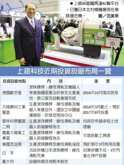 他表示,神戶市政府同意提供8千坪土地給上銀,購地還享有政府15%補助。如在日本設廠,上銀將是繼德國歐芬堡、芝加哥及蘇州廠后,第4個海外工廠。上銀在芝加哥建新廠,預計2017年首季末啟用量產滾珠絲桿及直線導軌后段產品。