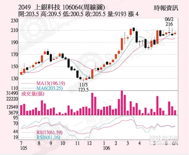 上銀(2049)滾珠絲桿、直線導(dǎo)軌及機(jī)器人三大主力商品年底前訂單滿載,法人預(yù)期,第2季合并營收挑戰(zhàn)50億元,6月新臺幣匯率回貶,第2季營收及獲利可望優(yōu)于第1季,三大法人上周五合計買超397張,激勵股價上漲1元、收205.5元,單周漲幅1.99%。