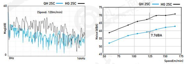 利用同步連接器可使?jié)L珠均勻等間隔的排列,滾珠和滾逐漸的相互撞擊金屬聲消失,尖銳的高頻聲音強(qiáng)度有效降低(見下圖),總和的噪音強(qiáng)度與舊有系列比較在各個(gè)速度域有效降低約低7.7分貝。