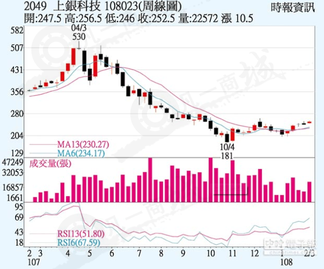 上銀科技1月合并營收16.67億元,雖出現(xiàn)近21個(gè)月新低,但法人樂觀自動(dòng)化設(shè)備需求會(huì)從年中開始回溫,對(duì)上銀滾珠絲桿、直線導(dǎo)軌等傳動(dòng)組件需求也增溫,外資及自營商上周五合計(jì)買超505張,帶動(dòng)股價(jià)上漲5.5元、收252.5元,周漲幅4.33%,收復(fù)周、月及季線。