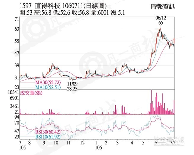 直得科技(1597)獲大和證遴選為臺(tái)灣機(jī)器人概念股之一,法人預(yù)期今年隨景氣好轉(zhuǎn)、拓展業(yè)務(wù)有成,直得營收會(huì)比去年兩位數(shù)成長,在外資及自營商聯(lián)手買超下,昨日成交爆大量,收盤前股價(jià)推升至漲停56.8元,上漲5.1元作收,一舉收復(fù)周線、月線及季線反壓套牢區(qū)。