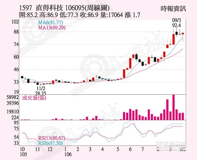 直得科技(cpc)生產(chǎn)微型直線導(dǎo)軌為主,因智能型手機(jī)及半導(dǎo)體設(shè)備商需求殷切,前7月EPS攀升至1.59元,法人預(yù)期全年EPS具有挑戰(zhàn)2元以上實(shí)力,上周六成交爆大量,推升股價(jià)至漲停86.9元收盤,上漲7.9元,突破5日、月線及季線反壓套牢區(qū),上周漲幅2.0%。