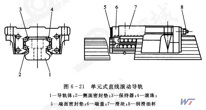 直線滾動(dòng)導(dǎo)軌是近年來新出現(xiàn)的一種滾動(dòng)導(dǎo)軌,其突出的優(yōu)點(diǎn)為無間隙,并且能夠施加預(yù)緊力,導(dǎo)軌的結(jié)構(gòu)如圖6—21所示。直線滾動(dòng)導(dǎo)軌由導(dǎo)軌體、滑塊、滾珠、保持器、端蓋等組成,它由生產(chǎn)廠家組裝成,故又稱單元式直線滾動(dòng)導(dǎo)軌。使用時(shí),導(dǎo)軌體固定在不運(yùn)動(dòng)部件上,滑塊固定在運(yùn)動(dòng)部件上。當(dāng)滑塊沿導(dǎo)軌體移動(dòng)時(shí),滾珠在導(dǎo)軌體和滑塊之間的圓弧宣槽內(nèi)滾動(dòng),并通過端蓋內(nèi)的滾道,從工作負(fù)荷區(qū)到非工作負(fù)荷區(qū),然后再滾動(dòng)回工作負(fù)荷區(qū),不斷循環(huán),從而把導(dǎo)軌體和滑塊之間的移動(dòng)變成滾珠的滾動(dòng)。目前,國內(nèi)、外中小型數(shù)控機(jī)床廣泛采用這種導(dǎo)軌。