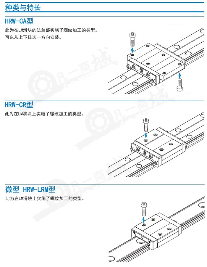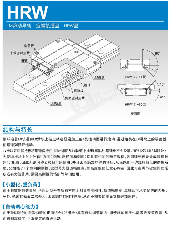 LM滑塊采用保持板精鋼球保持住,因此即使從,LM軌道中抽出來(lái)LM滑塊也不會(huì)脫落。(HRW12和14LR型除外)