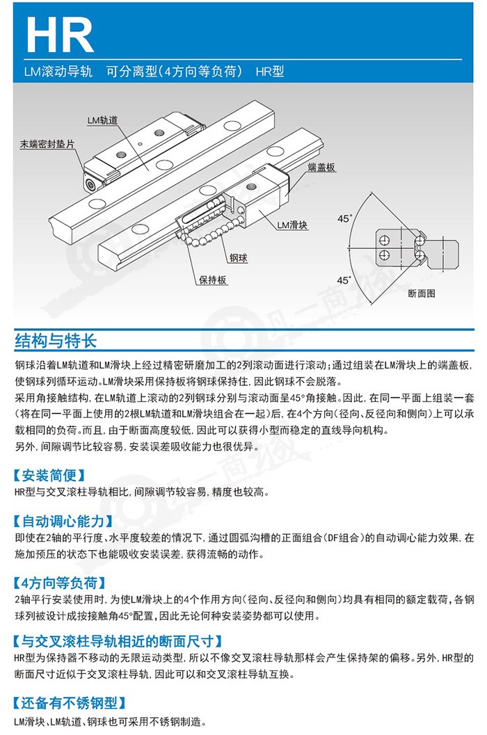 采用角接觸結構,在LM軌道上滾動的2列鋼球分別與滾動面呈45度角接觸。因此,在同一平面上組裝一套(將在同一面面上使用的2根LM軌道和LM滑塊組合在一起)后,在4個方向(徑向、反徑向和側向)上可以承載相同的負荷。而且,由于斷面高度較低,因此可以獲得小型而穩(wěn)定的直線導向機構。另外,予壓調節(jié)比較容易,安裝誤差吸收能力也很優(yōu)異。
